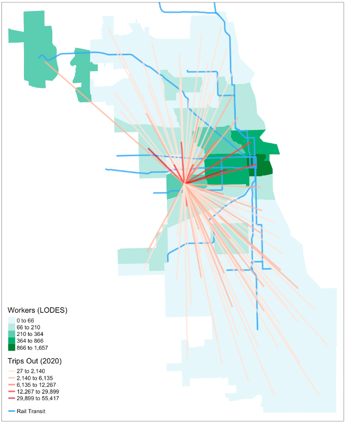Subsetting a large dataset of all rideshare trips made in Chicago since 2018 , I explore the higher-than-average per capita usage starting and ending in a lower-income neighborhood on Chicago’s West side, a sign that continued in-person work and transit service disruptions could have resulted in a financial burden in the form of rideshare spending