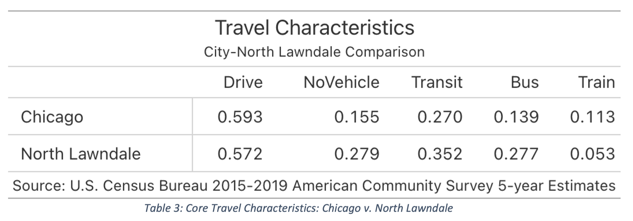 To gain some insight into who is likely to benefit from the Invest South/West developments, we can approach the issue by thinking about the relationship between income and travel mode which has been remarked as the most important determinant of travel mode by organizations such as the American Public Transportation Association (2017). Their work tells us that in general, bus transit tends to be highly used by the lowest-income workers and rail transit tends to be used by higher-income riders. In the context of a neighborhood like North Lawndale with a low- to median-income, it is important to nuance this schema and note that most users of transit in the area, regardless of travel mode, are likely captive users.
