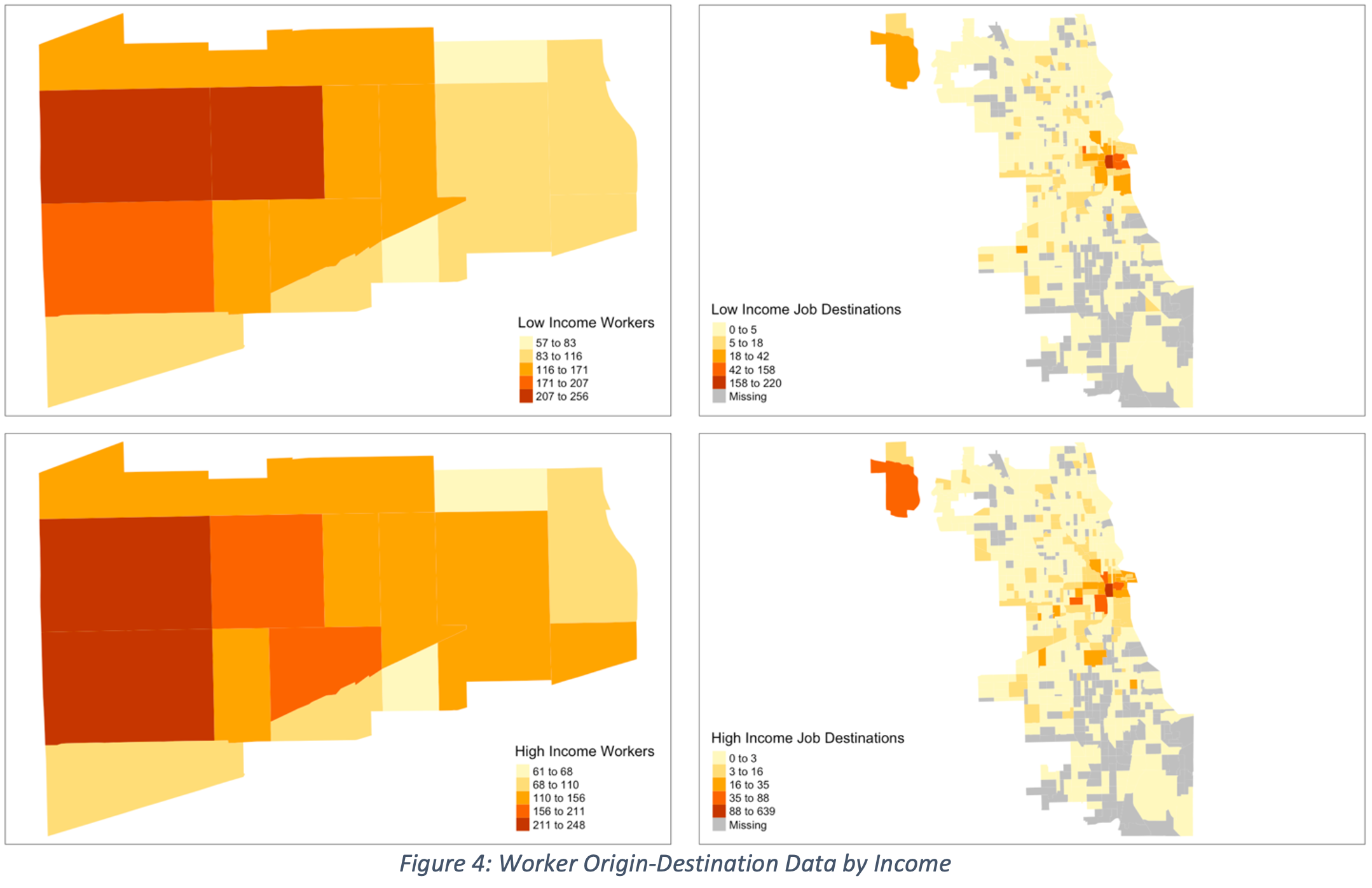 Looking at where North Lawndale residents travel for work, the case for both low-income and higher-income workers is that jobs are clustered around the loop though they diverge when we look at the number of workers who commute to places outside of the loop. In the case of low-income earners, a significant number of jobs are in census tracts outside of the loop whereas the clustering of higher-income jobs in the Loop is more dramatic.