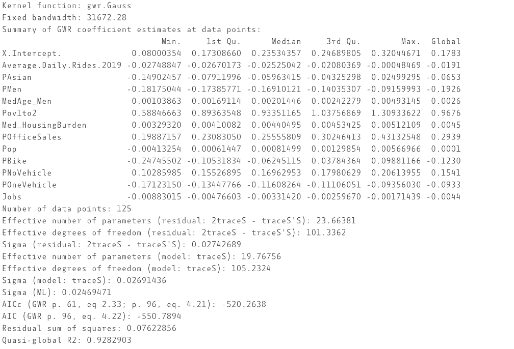 Having gained some insight into the major patterns of where travel continued at higher rates during the pandemic, the next step is to specify a geographic weighted regression of 2020 ridership on the reduced set of variables. An optimal bandwidth of 31,627.28 was calculated and the model is specified as follows: