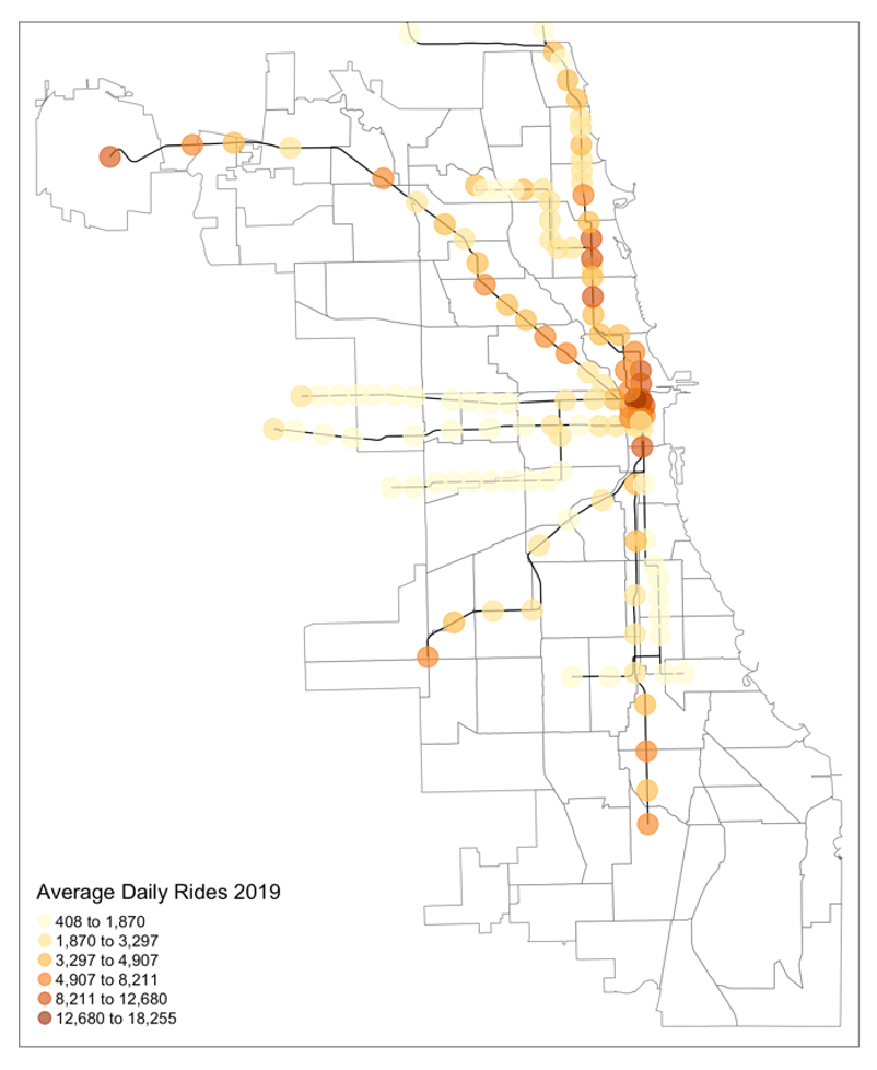 Above we see average daily rides per station in 2019 which I am using as my pre-pandemic baseline. Urban rail ridership in Chicago is concentrated in Chicago’s Downtown, North, and Northwest sides. While ridership at several stations on Chicago’s Southside have ridership levels comparable to Northside stations, rail transit is utilized less on the South and West sides where entries tend to be on the lower end of spectrum.