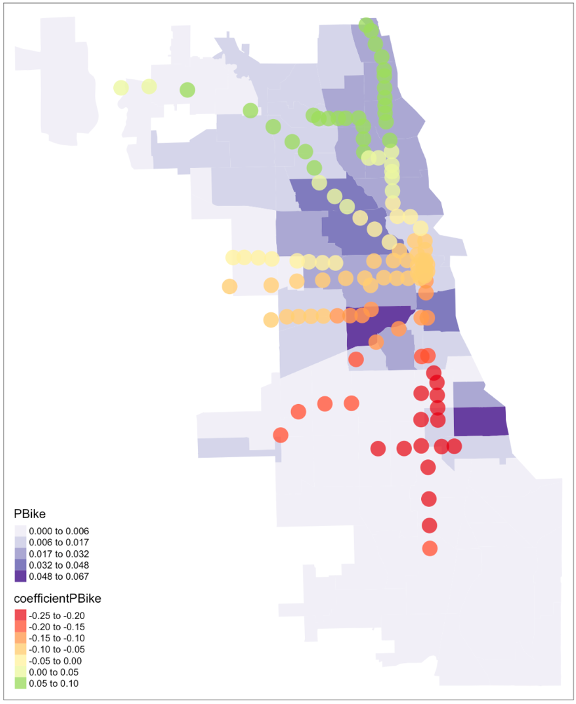 For example, we might look at the effect of ACS bike ridership estimates which is positive on the north side and negative everywhere else. One possible interpretation could be that on the Northside where bike infrastructure is higher quality and more extensive, biking is more widely used across various income groups and has less of correlation with our main determinant, poverty. On the Southside, it might be the case that where there is less bike infrastructure and lower levels of bike commuting because opportunities are further away, cycling reported in the ACS estimates might be associated with students and more affluent residents who might also be heavy transit users. The result might be that part of the income effect and internal variations in income are captured by biking levels on the Southside.